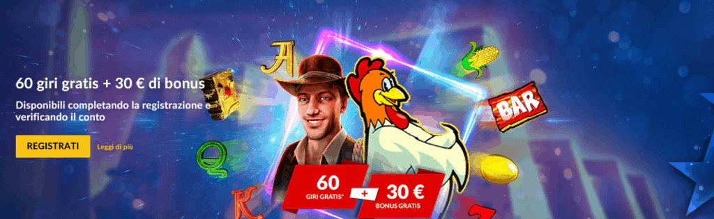 Giochi Software 1x2gaming, 4ThePlayer, Abzorba, AGT, Ainsworth, All41 Studios, Amatic Industries, Amusnet, Aristocrat, Armadillo Studios, Ash Gaming, Authentic Gaming, AvatarUX Studios, Baldazzi, Bally, Bally Wulff, Bang Bang Games, Barcrest, Belatra Games, Betixon, Betsoft, BF games, BGAMING, Big Time Gaming, Blueprint Gaming, Booming Games, Booongo, Caleta Gaming, Capecod Gaming, Consulabs, CQ9Gaming, Crazy Tooth Studios, Cristaltec, Dei casinò indipendenti, Dragon Gaming, DreamTech, Edict, EGT, ELK Studios, Endorphina, Espresso Games, Eurasian, Evolution Gaming, Evoplay, Eyecon, Fantasma Games, Fazi, FBM, Felix Gaming, Five Men Gaming, Fortune Factory Studios, Foxium, Funta Gaming, G Games, Game360, Gameart, Gameburger Studios, Gamenet, Gamomat, Gamzix, Genesis Gaming, Genii, GiocaOnline, Golden Rock Studios, Gong Gaming Technologies, Habanero, Hacksaw Gaming, High 5 Games, IGT, Inspired Gaming, Iron Dog Studio, iSoftbet, Jade Rabbit Studio, Jelly, Just For The Win, JVL, KA Gaming, Kalamba Games, Konami, Leander Games, Leap Gaming, Light & Wonder, Lightning Box Games, LuckSome, Mancala Gaming, Mascot Gaming, Medialive, Merkur Gaming, MGA, Microgaming, MrSlotty, NetEnt, Netent Live, NewAge Games, NextGen, Nolimit City, Northern Lights Gaming, Novomatic, Octavian Gaming, Onlyplay, Ortiz Gaming, Oryx, Paf, Pariplay, Pay Yoo, PearFiction Studios, Peter and Sons, Platipus, Play’n Go, PlayPearls, Playson, Playtech, Pragmatic Play, Pulse 8 Studios, Push Gaming, Quickspin, R.Franco Digital, Rabcat, Rarestone Gaming, Realistic, Realtime Gaming, Red Rake, Red Tiger, Red7, Reel Kingdom, Reel Time Gaming, ReelPlay, Reflex Gaming, Relax Gaming, Rival, RTG, RubyPlay, Salsa Technology, Scientific Games, Shuffle Master, SimplePlay, Skywind Group, Slotmill, Spearhead Studios, Spielo, Spinmatic, Spinomenal, Spinplay Games, StakeLogic, Stormcraft Studios, Swintt, SYNOT, Thunderkick, Tom Horn Gaming, Triple Edge Studios, Triple Profit Games, TrueLab, Tuko Productions, Urgent Games, Wazdan, WeAreCasino, Wild Streak Gaming, Wizard Games, WMG, WMS, World Match, Yggdrasil, ZeusPlay, Zitro Numero di giochi 771 Desktop, 702 Mobile Pagamento Metodi di deposito Visa, Postepay, Paypal, Bonifico Bancario, Master Card, Neteller, Paysafecard, Skrill, Sofort Tempi di pagamento 36 ore 18+ | Si applicano T&C | Gioca Responsabilmente | ADM