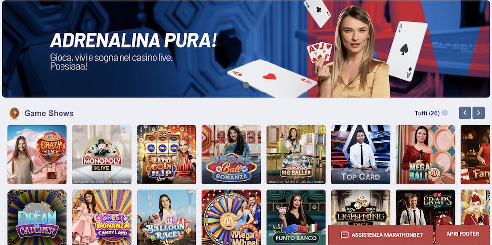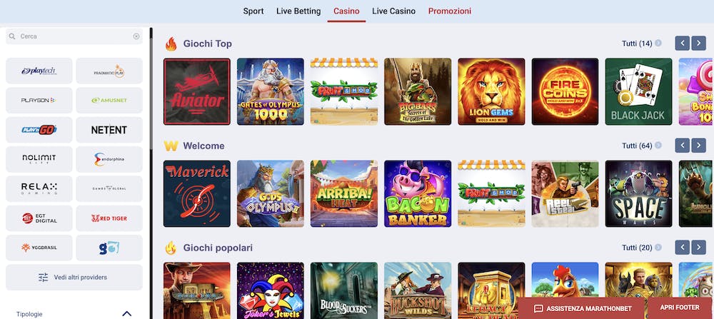Nonostante Marathonbet sia ancora non troppo conosciuto in Italia si affida a un ottimo catalogo di giochi per il suo comparto del casinò, ma anche un palinsesto sportivo di tutto rispetto. Potrai infatti spaziare tra: slot machine classiche e moderne, tavoli di roulette, blackjack, poker e baccarat firmati da fornitori come NetEnt, Playtech, Pragmatic Play, Relax Gaming, Evolution e molto altro ancora.