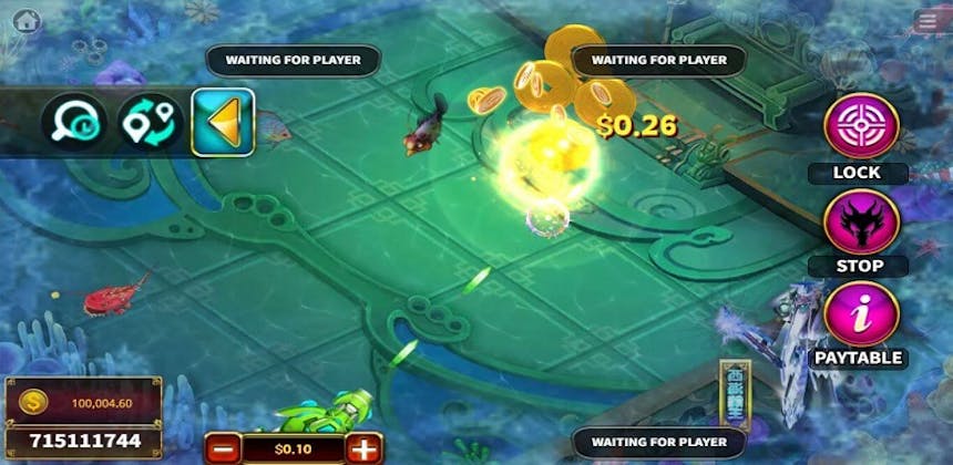 Una puntata di 0,10 dollari è visibile nell’angolo in basso a sinistra. Le monete d’oro fuoriescono da un pesce distrutto, generando una vincita di 0,26 dollari.