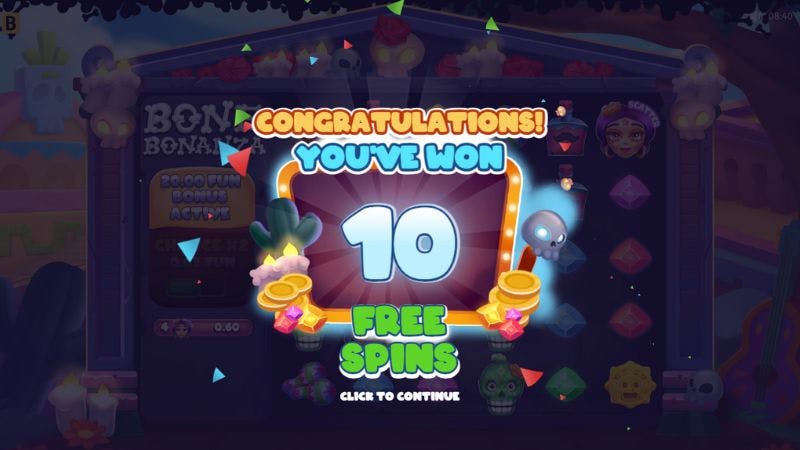 Il simbolo scatter di Bone Bonanza è la senorita messicana, che paga 3x, 5x o 100 volte la puntata, a seconda che se ne ottengano 4, 5 o 6. Questo è anche il simbolo che innesca i free spins, 10, 20 o 30 giri gratuiti a seconda del numero di scatter ottenuti.