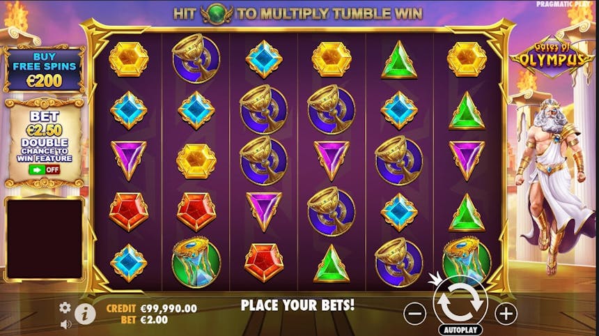 La slot Gates of Olympus ha una griglia 6×5 e presenta l’immagine di Zeus sul lato destro.