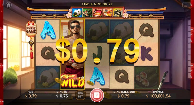 Il busto di un cuoco della Yakuza è il simbolo wild della slot Gokudo Bentou di KA gaming. Può comparire solo sui tre rulli centrali ed ha la funzione di sostituire tutti i simboli regolari del gioco. Inoltre, i simboli jolly si espandono fino a coprire l’intero rullo, sia nel gioco base che nella funzione Free Games.