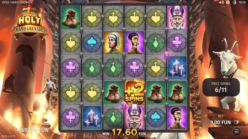 Stranamente, in questa slot Holy Hand Grenade non c’è un simbolo wild. Tuttavia, una capra dall’aspetto santo con la scritta “BONUS” funge da scatter. Se si ottengono tre o più di questi simboli, si attiva il gioco dei giri gratuiti.