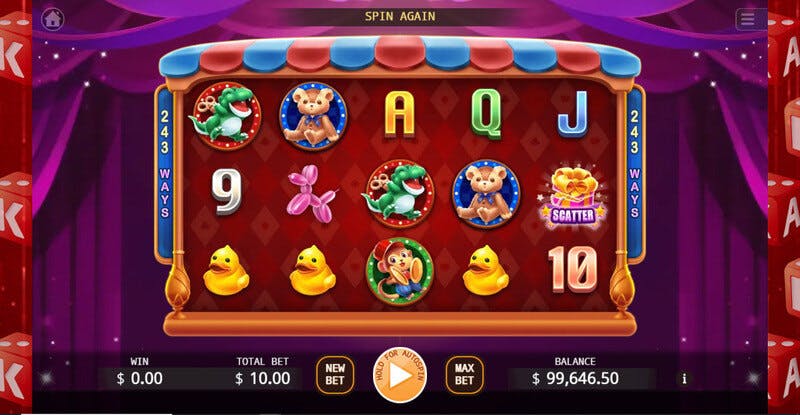 Con questa particolare slot, KA Gaming vuole farci vivere tutto il divertimento del parco giochi. I simboli del gioco girano all’interno di quella che sembra essere una bancarella del luna park, con tanto di tendone rosso e blu. Sullo sfondo si notano drappi viola che ricordano il tendone di un circo.