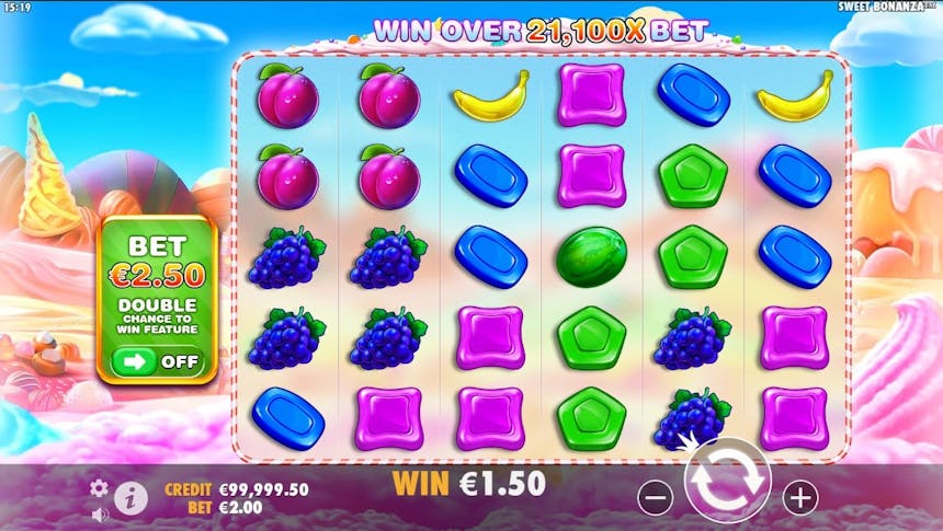 L’azione della slot Sweet Bonanza si svolge su una griglia 6×5. L’aspetto interessante è che non si è limitati dalle linee di pagamento per quanto riguarda i modi per vincere. Al contrario, ci sono pagamenti scatter. Ciò significa che è possibile abbinare i simboli in qualsiasi punto della griglia, senza bisogno che siano allineati. In questo modo le opportunità di vincita sono di gran lunga maggiori. Per quanto riguarda la slot machine Sweet Bonanza e i limiti di puntata, il livello più basso è di 0,20 euro. Ci piace vedere slot con una puntata minima bassa, perché nessun giocatore viene escluso. Anche con un budget limitato, è possibile godere di ciò che viene offerto. Nella fascia più alta, la puntata massima è di 125 euro. Si tratta di una scommessa di tutto rispetto, anche se non raggiunge il livello di Thrill to Grill, dove si possono scommettere fino a 200 euro per giro.